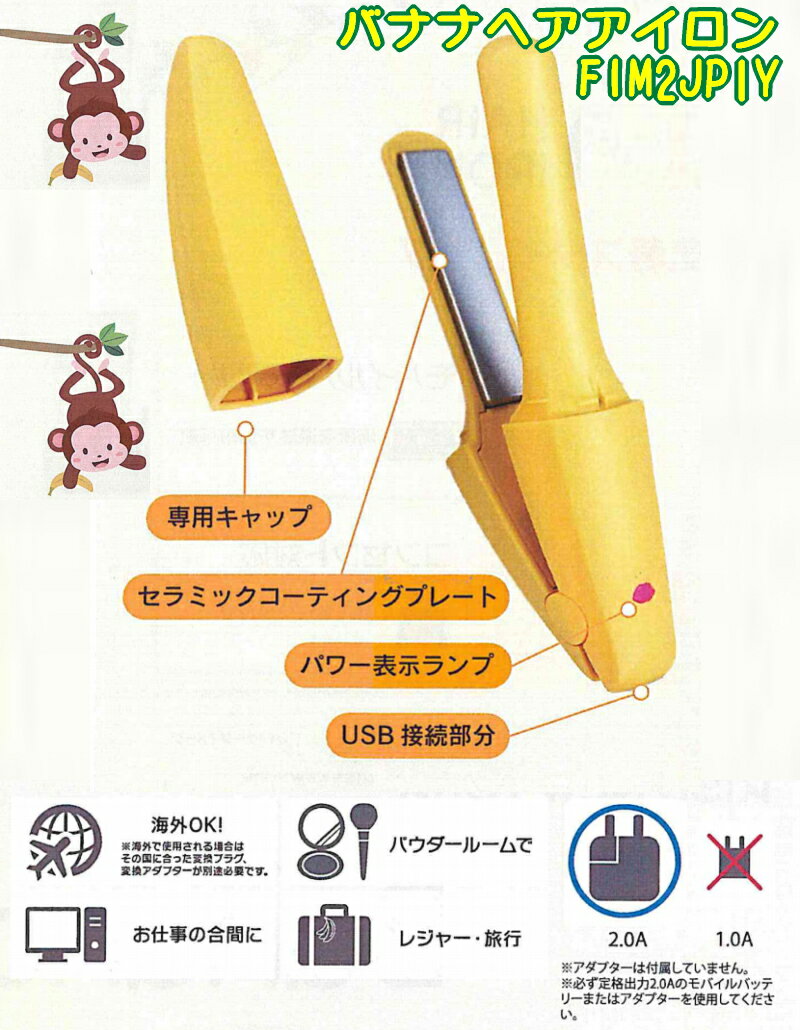 商品名 バナナヘアアイロン FIM2JP1Y 型番 FIM2JP1Y 機能 ※バナナの形の可愛いデザイン ※ミニサイズで持ち運び便利なヘアアイロン ※海外対応OK ※モバイルバッテリー ※USBケーブル 電源 100〜240V 50 / 60Hz 出力 DC 5V 2A サイズ 約W146×D35×H31mm 重量 83g 付属品 USBケーブル、ポーチ 特記事項 ※使用中や使用後はロッド部・スタンド部周辺は非常に高温になります。