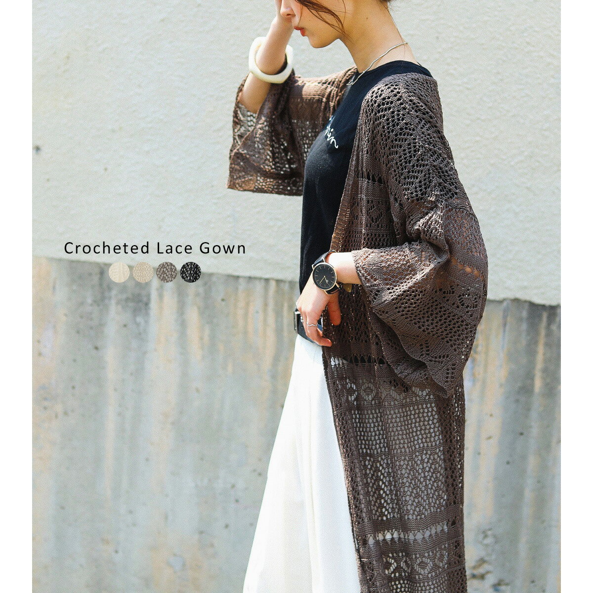 レース 総レース かぎ編みレース ガウン ロング丈 カーディガン 羽織り ライトアウター スプリングアウター セットアップ マキシ丈 クロシェットレース レディース シースルー 透け感 裏地 ベージュ モカ ブラック ファッション ママ かわいい 春夏 涼しい